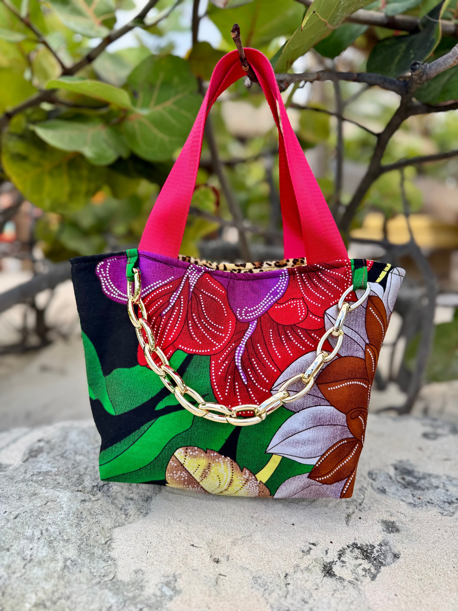 this unique tote is designed with a bold vibrant floral cotton pattern with red handles and gold toned plastic chain accessory with an animal printed interior